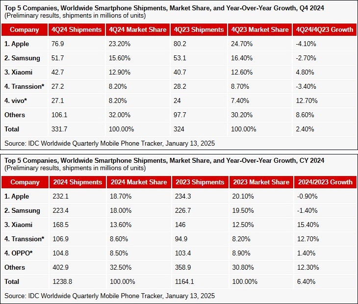 सन् २०२४ को पूरै नतिजा हेर्दा एप्पल र सामसङले प्याकको नेतृत्व गरे तापनि सन् २०२३ को तुलनामा थोरै कम नतिजाहरू देखेको बताइएको छ। यद्यपि तेस्रो स्थानमा रहन सफल भएको शाओमीले भने उत्कृष्ट वर्ष बिताएको उल्लेख गरिको छ।