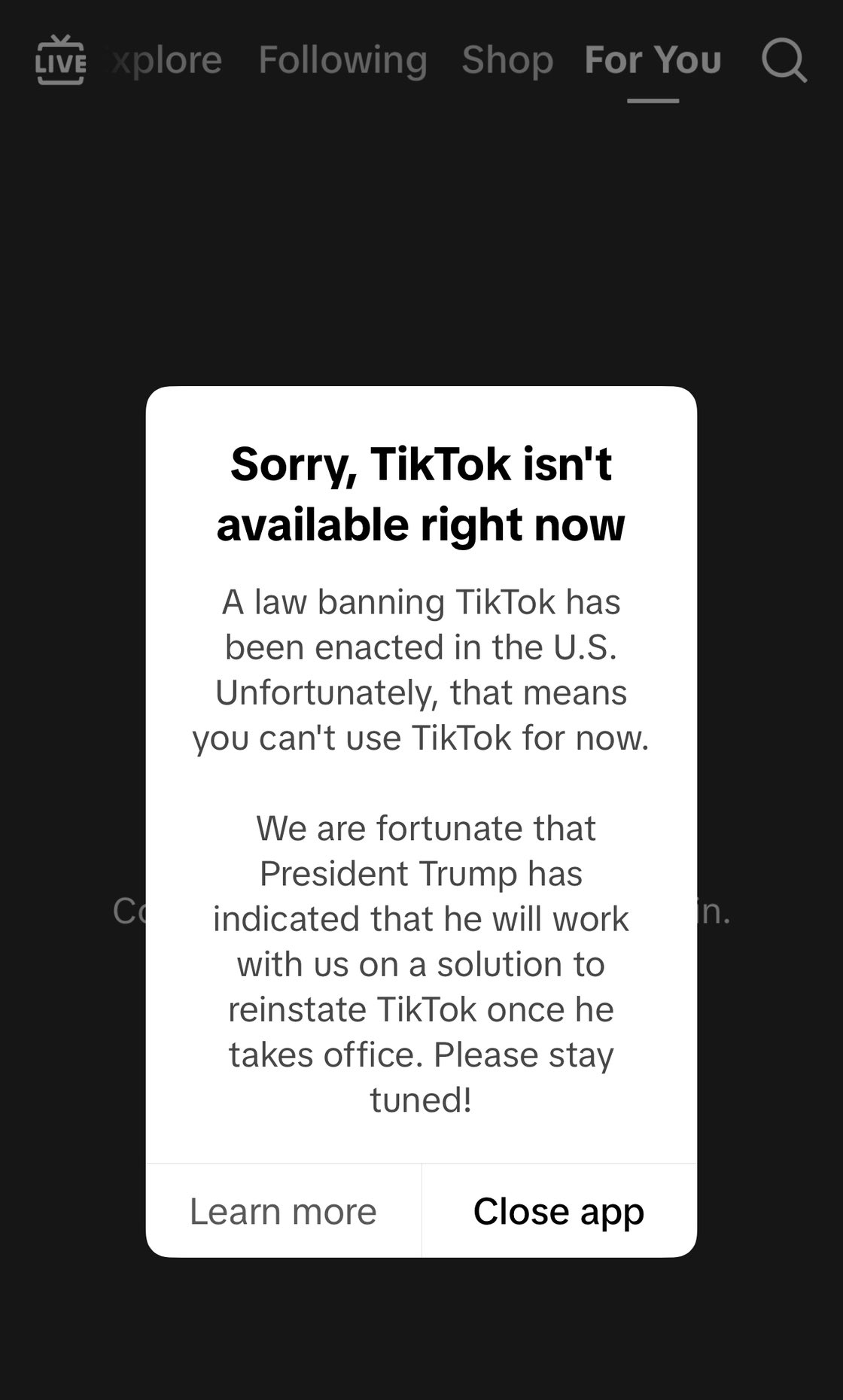“अमेरिकामा टिकटकलाई प्रतिबन्ध लगाउने कानून लागू गरिएको छ,” अंग्रेजी भाषाको सन्देशमा भनिएको छ, “दुर्भाग्यवश यसको अर्थ तपाईंले अहिलेको लागि टिकटक प्रयोग गर्न सक्नुहुन्न।”