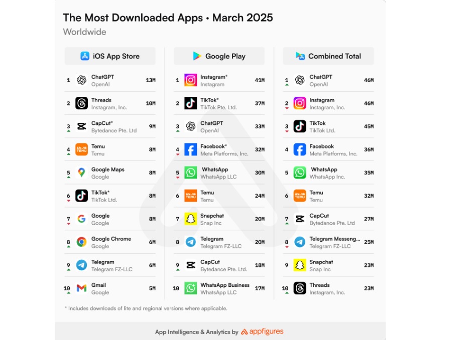 यस बाहेक मार्च महिनामा, मेटाका सहित अन्य सामाजिक एपहरूले शीर्ष सूचीहरूमा पर्न सफल भएका छन्। फेसबुक र व्हाट्सएप शीर्ष पाँच स्थानभित्र परेका छन् टेमुसँगै क्यापकट, टेलिग्राम, स्न्यापच्याट, र मेटाको थ्रेड्स जस्ता अन्य एपहरू शीर्ष १० मा परेका छन्।