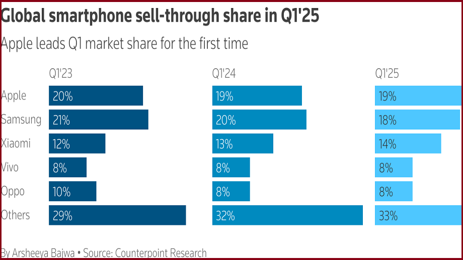 एप्पलले सन् २०२५ को पहिलो त्रैमासिकमा नयाँ आईफोन १६ई को सार्वजनिक र जापान तथा भारतजस्ता देशहरूमा बलियो मागका कारण विश्वव्यापी स्मार्टफोन बिक्रीमा पहिलो स्थान हासिल गरेको छ। यो तथ्यांक काउन्टरपोइन्ट रिसर्चले सोमबार सार्वजनिक गरेको हो।