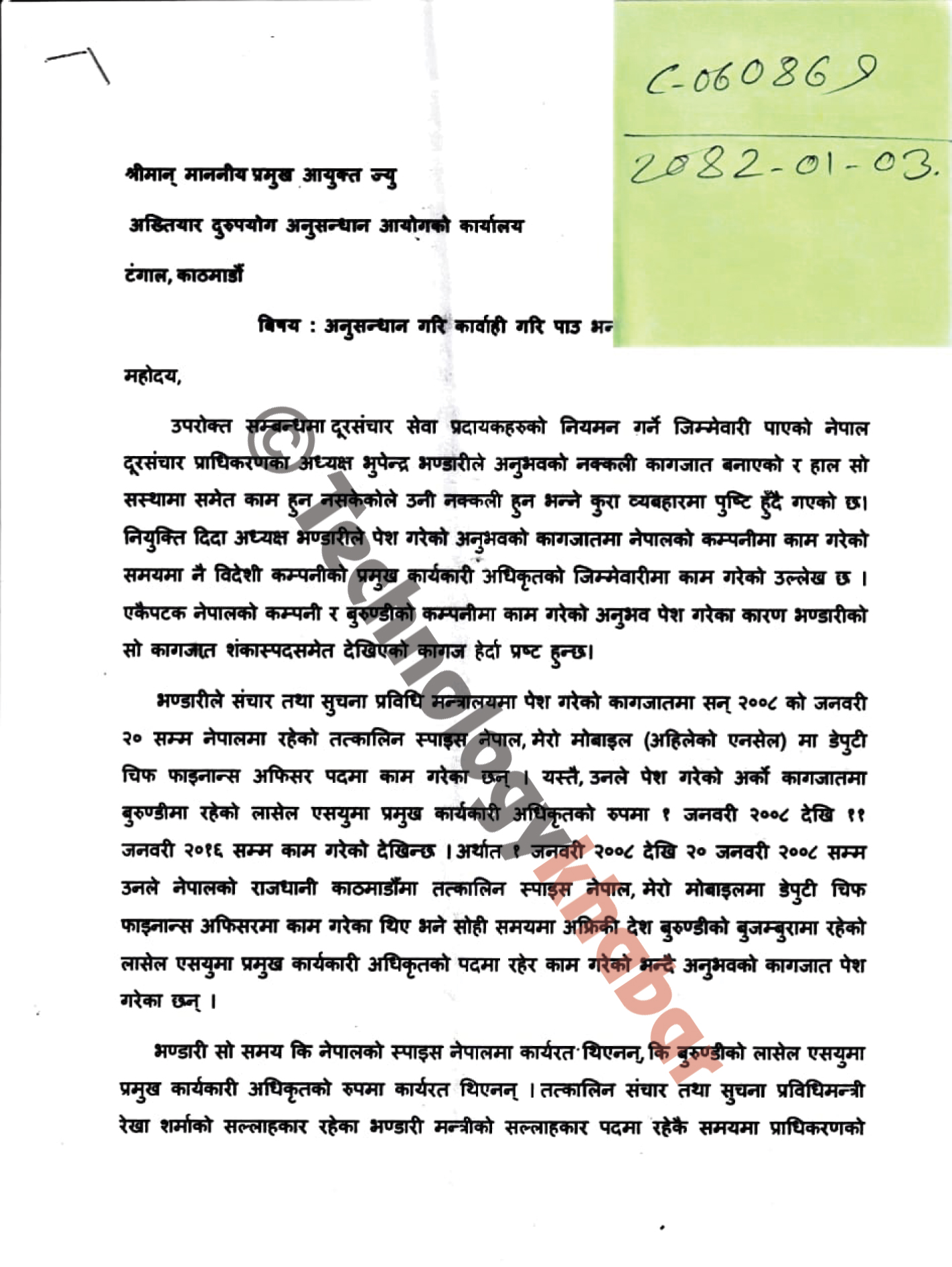 नेपाल दूरसञ्चार प्राधिकरणका अध्यक्ष भुपेन्द्र भण्डारीको कार्यअनुभवको कागजात नक्कली भएको भन्दै अख्तियार दुरुपयोग अनुसन्धान आयोगमा उजुरी परेको छ।