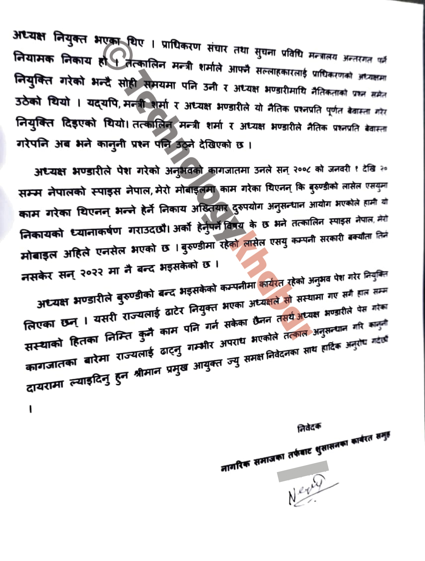 “तसर्थ अध्यक्ष भण्डारीले पेस गरेका कागजातका बारेमा राज्यलाई ढाँट्नु गम्भीर अपराध भएकोले तत्काल अनुसन्धान गरि कानुनी दायरामा ल्याइदिनु हुन श्रीमान प्रमुख आयुक्त ज्यु समक्ष निवेदनका साथ हार्दिक अनुरोध गर्दछौं,” नागरिक समाजका तर्फबाट शुसासनका कार्यरत समूहले पत्रमा लेखेको छ।
