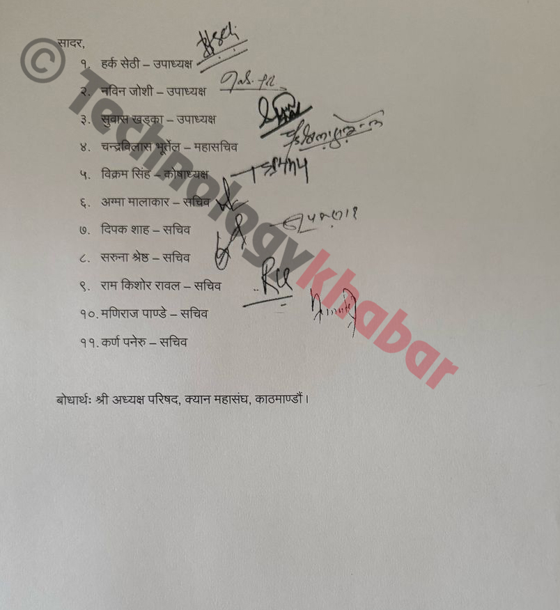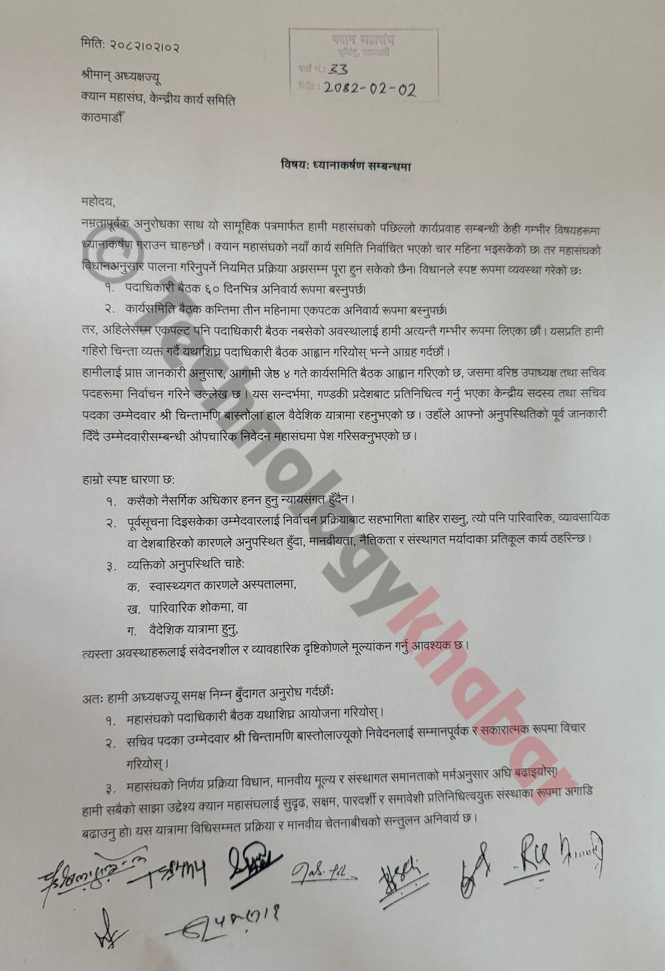 यसअघिनै, आजको बैठक सार्न माग गर्दै ११ जना पदाधिकारीहरुले क्यान अध्यक्ष पाण्डेसमक्ष २०८२ जेठ २ गते ध्यानाकर्षण पत्र दर्ता गराएका थिए।