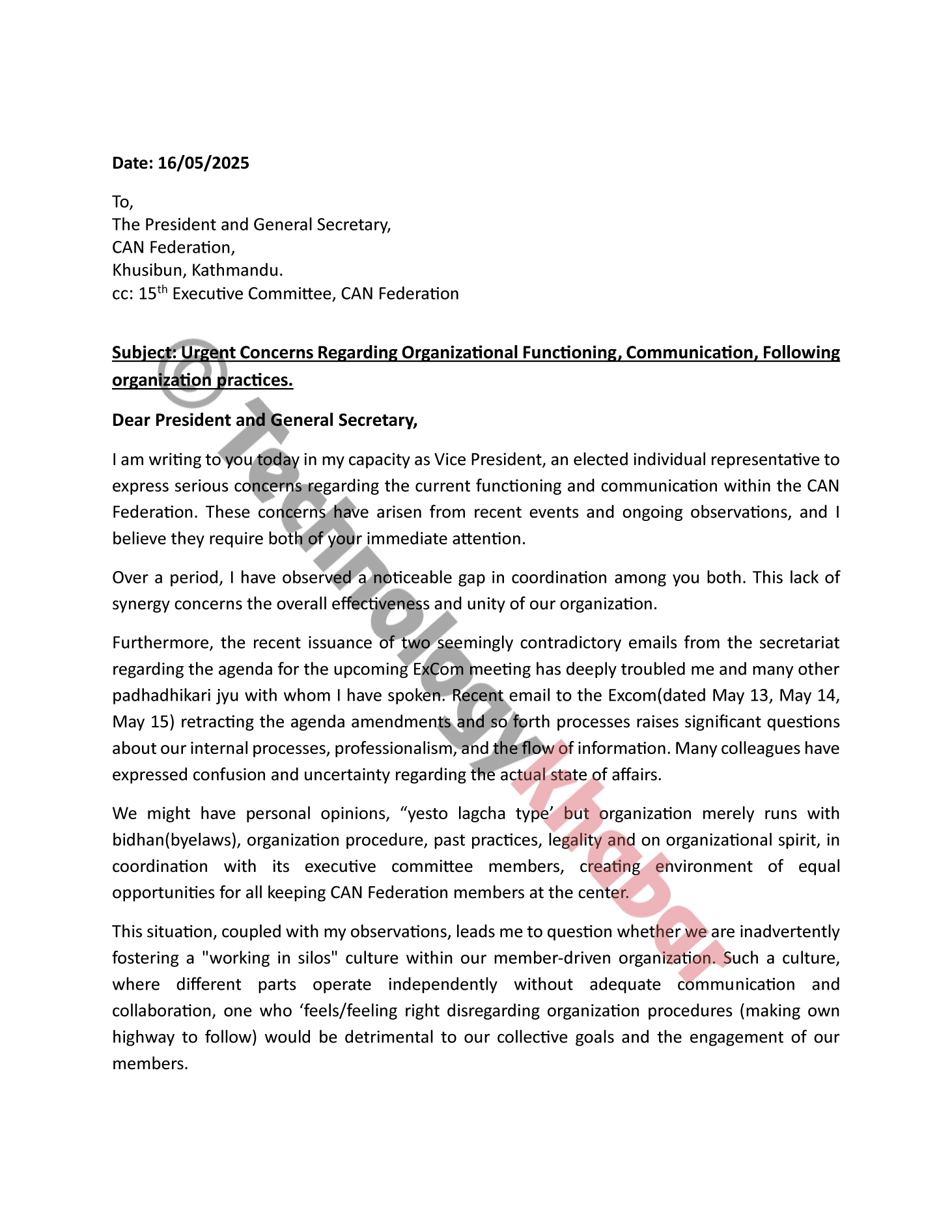 हामीले ओबी (पदाधिकारी) बैठक र त्यसपछि कार्यकारी समितिको बैठक गर्ने अभ्यास पनि गरेका थियौं। यस अवस्थामा, जब मैले अधिकारीहरूलाई सोधें, यो पूर्ण रूपमा बेवास्ता गरिएको देखियो,” उनले क्यानलाई पठाएको पत्रमा लेखेका छन्,”यस्तो संस्कृति: ‘जे सजीलो, लाग्यो त्यहि गर्ने, बिधि पद्दतिको ख्यालनै नगर्ने, बेवास्था, कहिँ बाधा अड्चन छन भने सोको बारेमा  समेत छलफल नगर्ने’ म लगायतका वर्तमान समितिका सदस्यहरूको लागि हानिकारक छ।”