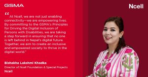“हामीले केवल सम्पर्क स्थापित गर्ने कनेक्टिभिटी सेवा मात्र उपलब्ध गराइरहेका छैनौं, हामी मानिसहरुलाई सशक्त बनाइरहेका छौं। जीएसएमएसँग अपाङ्गता भएका व्यक्तिहरूको डिजिटल समावेशीकरण प्रवद्र्धन गर्ने यी सिद्धान्तहरूमार्फत हामी नेपालको डिजिटल भविष्यमा कोही पनि पछि नपरोस् भन्ने सुनिश्चित गर्न महत्वपूर्ण कदम अगाडि बढिइरहेका छौं। हातेमालो गर्दै, हामीले डिजिटल दुनियामा सफल हुने समावेशी र सशक्त समाज निर्माण गर्ने लक्ष्य राखेका छौं।” एनसेलकी एनसेल फाउन्डेसन एन्ड स्पेशल प्रोजेक्ट डाइरेक्टर विशाखा लक्ष्मी खड्काले भनिन् ।