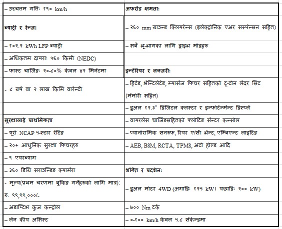 नेपालको इतिहास मै पहिलो पटक यस्तो उचाइमा लक्जरी इलेक्ट्रिक पिकअपको आधिकारिक रुपमा सार्वजनिक भएको हो। एग्रेसिभ लुक भएको यो पिकअप नेपालमा आयात हुने कुनै पनि अन्य पिकअप भन्दा हरेक कुरामा अब्बल रहेको छ भनेर कम्पनीको दावी छ।