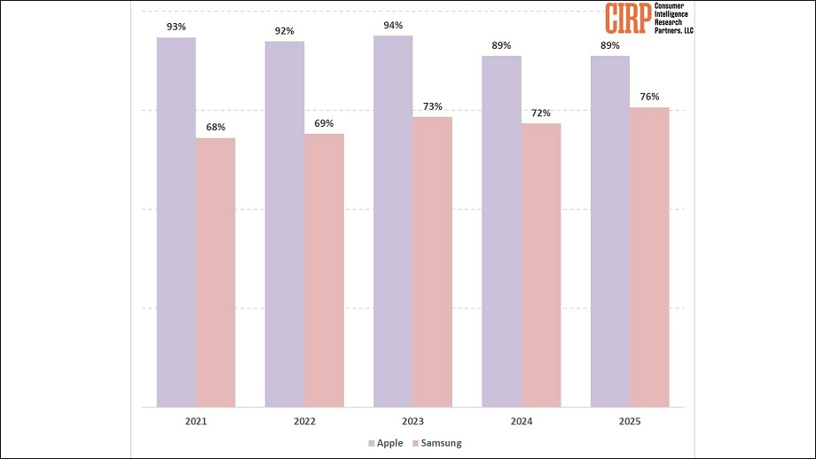 तुलनाको लागि, सामसङ प्रतिको लोयल्टि (वफादारी) सन् २०२१ र सन् २०२५ को बीचमा ६८ प्रतिशत बाट ७६ प्रतिशतमा पुगेको र ८ प्रतिशतले वृद्धि भएको बताइएको छ। यद्यपि, रिपोर्टमा स्याम्पल साइज (नमूना आकार) वा मार्जिन इरर (त्रुटि) जस्ता विशिष्ट डाटाको अभाव रहेको उल्लेख गरिएको छ।