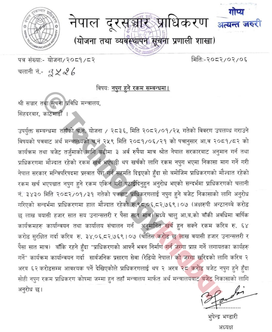 प्राधिकरणले यहि जेठ ६ गते सञ्चार तथा सूचना प्रविधि मन्त्रालयलाई पत्र पठाउँदै आ.व २०८१/८२ को कार्यक्रम तथा बजेट तर्जुमाको लागि नपुग हुने रकम निकासा गराई दिन माग गरेको हो।