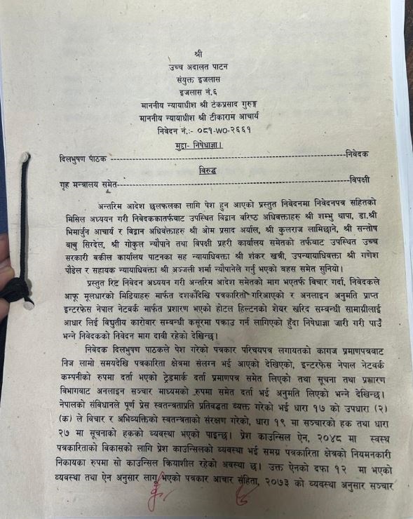 ‘साइबर ब्यूरो ५९’को जाहेरीको आधारमा पक्राऊ पुर्जी जारी भएकोमा पत्रकार पाठकले सो आदेशका विरुद्धमा उच्च अदालत पाटनमा निषेधाज्ञाको निवेदन दिएका थिए।