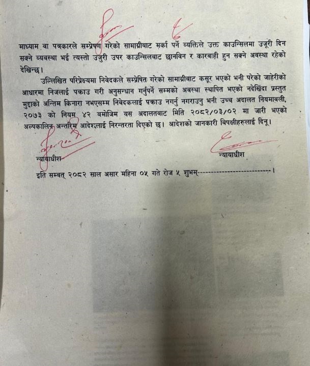 “निवेदकले सम्प्रेषित गरेको सामग्रीबाट कसूर भएको भनी परेको जाहेरीको आधारमा निजलाई पक्राउ गरी अनुसन्धान गर्नुपर्नेसम्मको अवस्था स्थापित भएको नदेखिँदा प्रस्तुत मुद्दाको अन्तिम किनारा नभएसम्म निवदेकलाई पक्राउ नगर्नू भनी उच्च अदालत नियमावली २०७३ को नियम ४२ बमोजिम यस अदालतबाट जारी भएको अल्पकालीन आदेशलाई निरन्तरता दिएको छ ।”