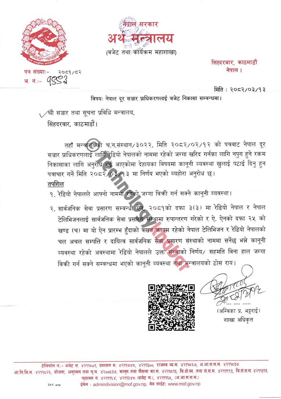 यसअघि सञ्चार तथा सूचना प्रविधि मन्त्रालयले नेपाल दूरसञ्चार प्राधिकरणको पत्रलाई उदृत गर्दै २०८१ जेठ १२ गते अर्थ मन्त्रालयलाई पत्र पठाएर प्राधिकरणलाई रेडियो नेपालको नाममा रहेको जग्गा खरिद गर्नका लागि नपुग हुने रकम निकासाका लागि अनुरोध गरेको थियो।