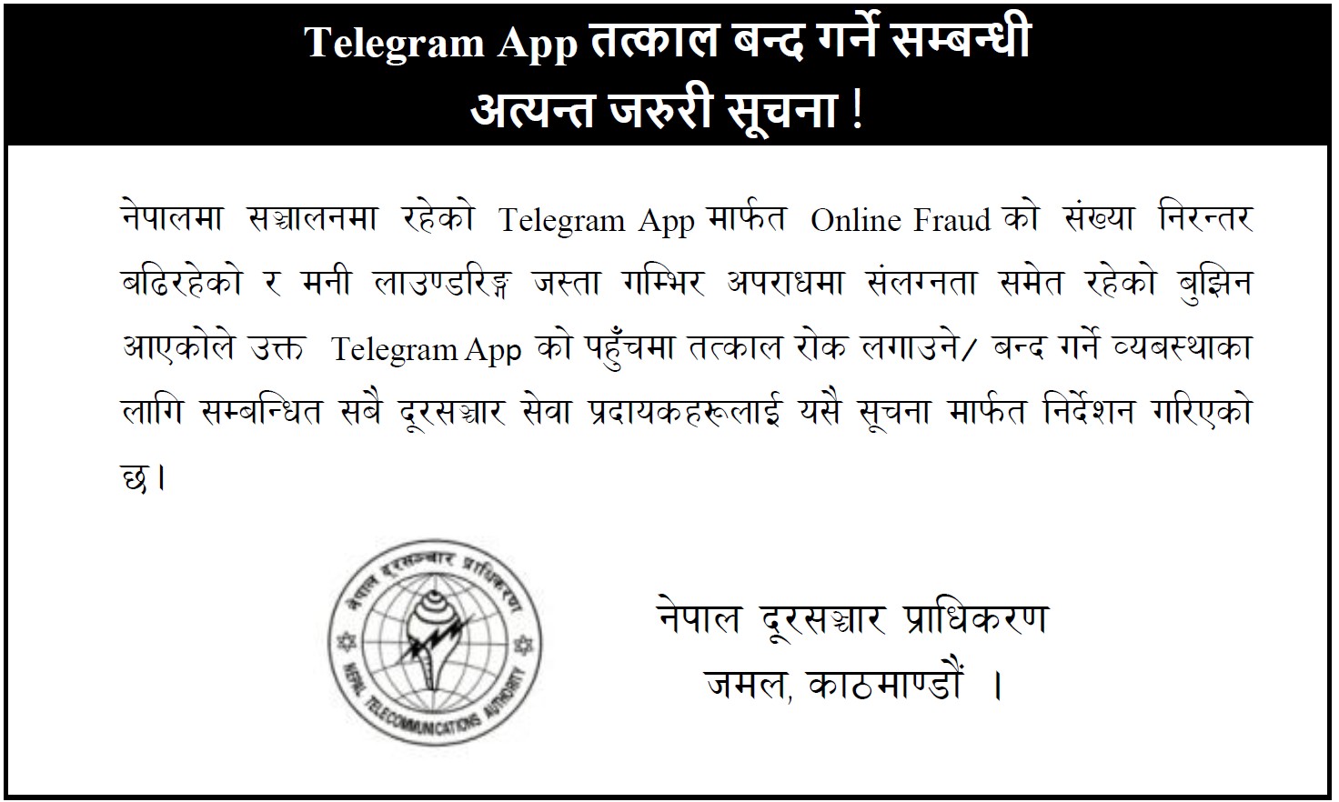 प्राधिकरणले सार्वजनिक सूचना जारी गर्दै सबै सेवा प्रदायकहरुलाई टेलिग्राम एपको पहुँचमा तत्काल रोक लगाउन निर्देशन दिएको हो।