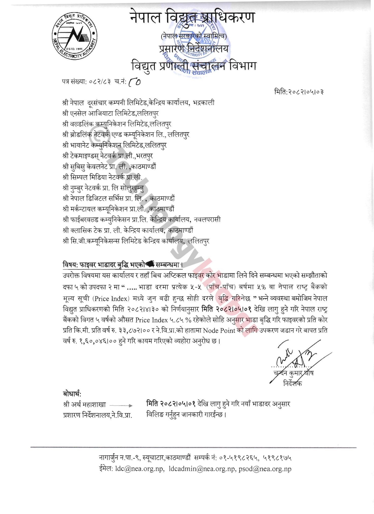 प्राधिकरणले पठाएको पत्रमा भनिएको छ, “नेपाल विद्युत प्राधिकरणको मिति २०८२/४/३० को निर्णयानुसार मिति २०८२/०५/०१ देखि लागु हुने गरि नेपाल राष्ट्र बैंकको विगत ५ वर्षको औसत Price Index ५.८५% रहेकोले सोहि अनुसार भाडा बृद्धि गरि फाइवरको प्रति कोर प्रति कि.मी. प्रति वर्ष रु. ३३,८७२।०० र ने.वि.प्रा. को हातामा Node Point को लागि उपकरण जडान गरे बापत प्रति वर्ष रु.१,६०,०४६।०० हुने गरि कायम गरिएको व्यहोरा अनुरोध छ।”