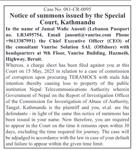 नेपाल दूरसञ्चार प्राधिकरणले दूरसञ्चार कम्पनीहरुले भ्वाइसमार्फत कर छलेको भन्दै लागू गर्न खोजेको टेरामोस (वा टेरामोक्स) को परामर्शदाताको रुपमा सिस्टम बनाउने ठेक्का पाएको भ्यानराइज सोलुसन एसएएल (अफशोर), त्यसका सीईओ जमाल वाफिक अनौटी तथा त्यसको स्थानीय कम्पनीलाई अदालतले सुनुवाई हुनुभन्दा अगाडि अदालतमा उपस्थित हुन सूचना जारी गरेको हो। अदालतले भदौ २ गते अंग्रेजी भाषामा सार्वजनिक सूचना जारी गर्दै नेपाल दूरसञ्चार प्राधिकरणको सम्पत्तिलाई हानि पुर्याउने बदनियतले टेरामोक्स खरिद गर्दा भ्रष्टाचार गरेको मुद्दाको सम्बन्धमा १५ मे, २०२५ मा अदालतमा आरोपपत्र दायर गरिएको जानकारी गराएको छ।