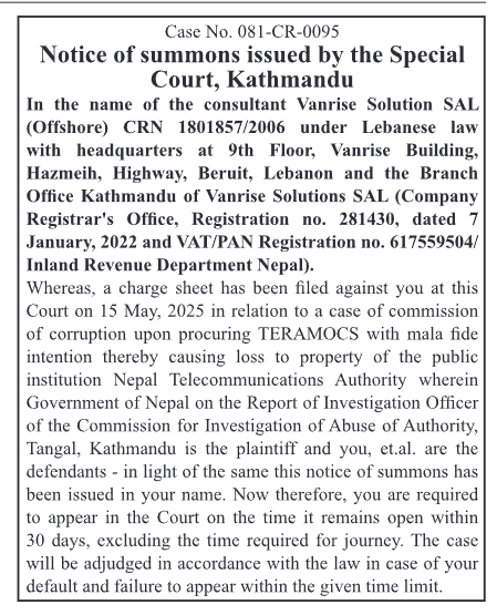 विशेष अदालतको सूचनाअनुसार लेबनानी कानून अन्तर्गत ९ औं तल्ला, भ्यानराइज बिल्डिंग, हाजमेह, हाइवे, बेरुत, लेबनानमा मुख्यालय रहेको परामर्शदाता भ्यानराइज सोलुसन एसएएल (अफशोर) सीआरएन १८०१८५७/२००६ का साथै भ्यानराइज सोलुसन एसएएलको काठमाडौँ शाखा कार्यालय (कम्पनी रजिस्ट्रार कार्यालयको दर्ता नम्बर २८१४३०, मिति ७ जनवरी, २०२२ र भ्याट/प्यान दर्ता नम्बर ६१७५५९५०४) मा दर्ता भएको कम्पनीलाई अदालतमा हाजिर हुन भनिएको छ।