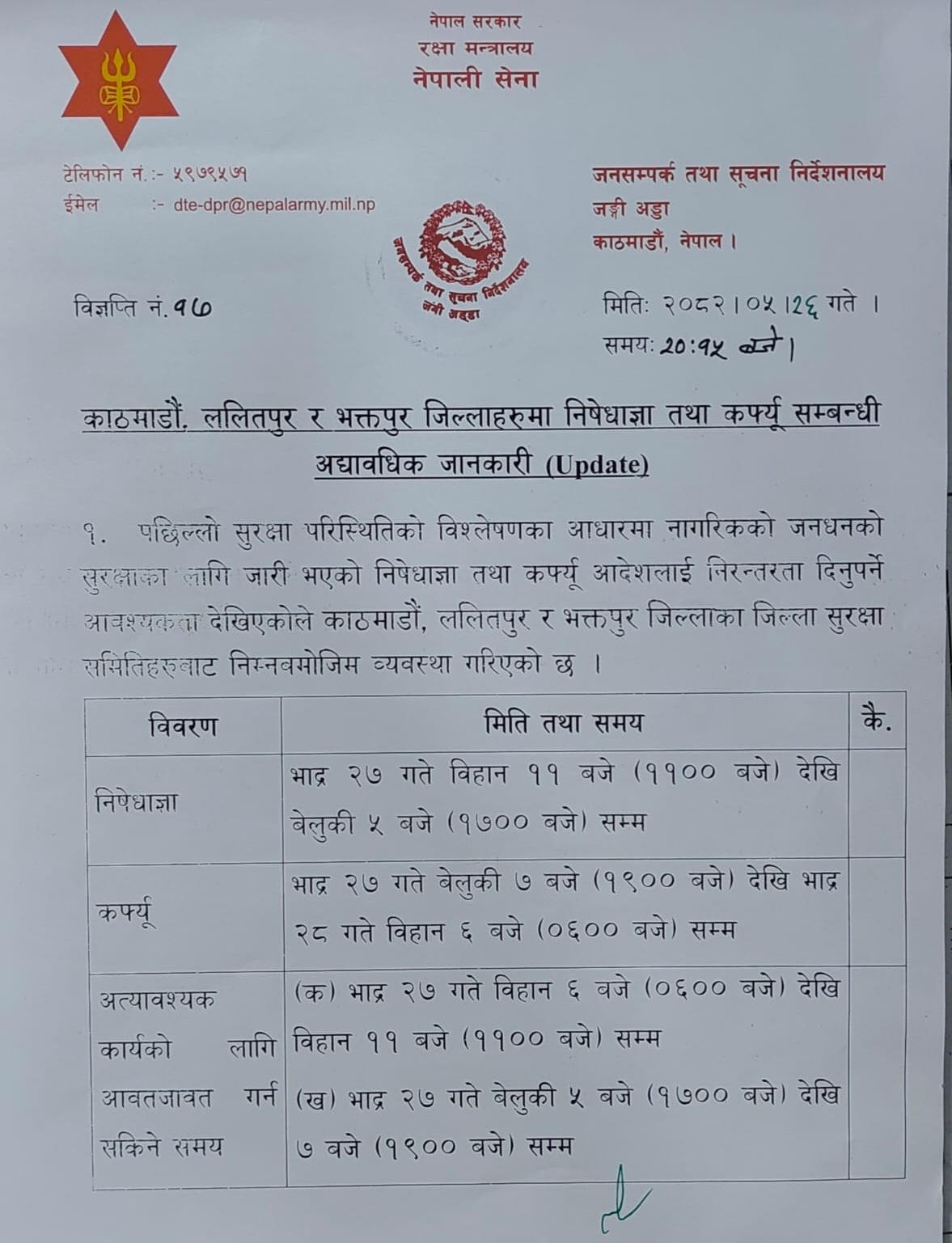 नेपाली सेनाले काठमाडौं, भक्तपुर र ललितपुरमा भोलि (भदौ २७ गते) पनि दिनभर निषेधाज्ञा र राति कर्फ्यू जारी रहने जानकारी दिएको छ।