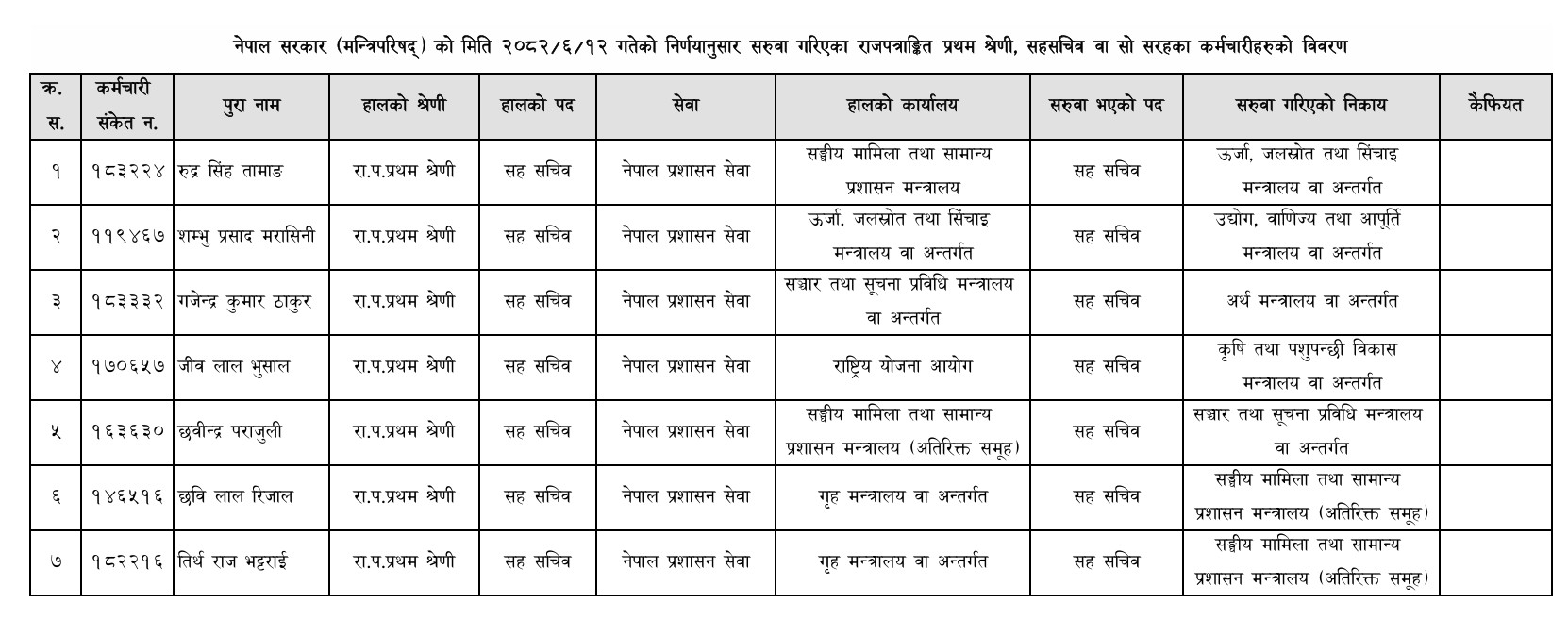 यसै निर्णयअनुसार सङ्घीय मामिला तथा सामान्य प्रशासन मन्त्रालय (अन्तरगत सरुवा) का सहसचिव छविन्द्र पराजुलीलाई सञ्चार तथा सूचना प्रविधि मन्त्रालयमा ल्याइएको छ। पराजुली यसअघि पनि प्रशासनिक सुधार तथा संघीय संरचना व्यवस्थापनमा सक्रिय सहसचिवको रूपमा परिचित रहेका थिए।