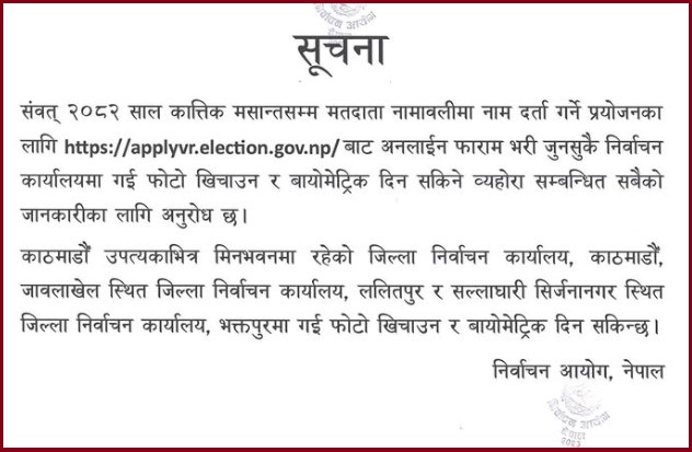 निर्वाचन आयोगले आगामी मतदाता नामावली अद्यावधिक कार्यक्रमअन्तर्गत नाम दर्ता गर्न इच्छुक नागरिकहरूलाई अनलाइन फाराम भरेर बायोमेट्रिक प्रक्रिया पूरा गर्न अनुरोध गरेको छ।