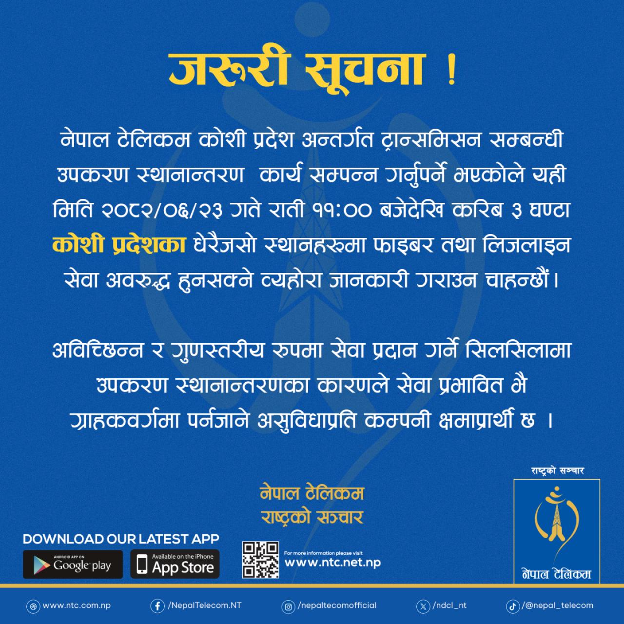 नेपाल टेलिकमको कोशी प्रदेशका अधिकांश स्थानहरुमा आज राती करिब ३ घण्टा फाइबर तथा लिजलाइन सेवा अवरुद्ध हुनसक्ने भएको छ।