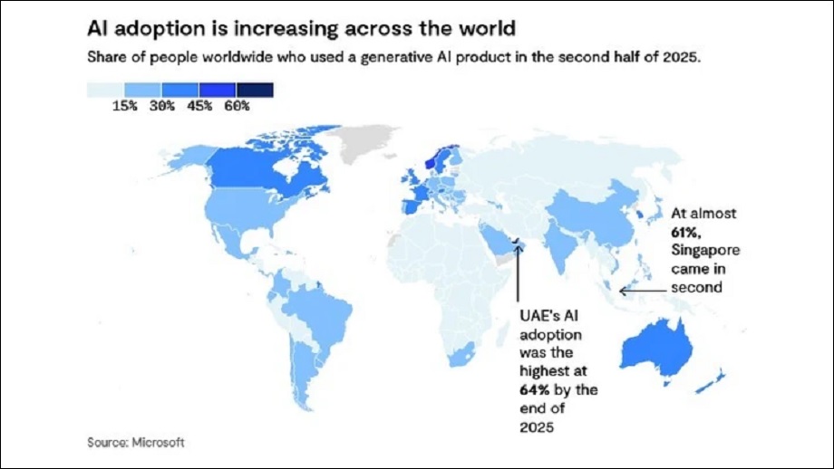 विश्वभर फैलिँदै गइरहेको आर्टिफिसियल इन्टेलिजेन्सको मूल्याङ्कन गर्ने माइक्रोसफ्टको हालैको रिपोर्ट अनुसार गत वर्ष जनसंख्याको ६० प्रतिशतभन्दा बढीले कुनै न कुनै प्रकारको उत्पादनशील आर्टिफिसियल इन्टेलिजेन्स उपकरण प्रयोग गर्दै संयुक्त अरब इमिरेट्स र सिङ्गापुर अरू देशहरू भन्दा फरक छ।