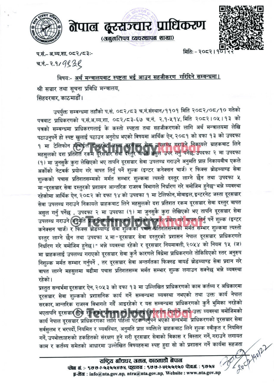 “नेपाल दूरसञ्चार प्राधिकरणले दूरसञ्चार सेवा दस्तुर (TSC) योग्य महशुलको गणना गर्ने बिधि (देहाय बमोजिमको उदाहरण वा अन्य) सम्वन्धमा श्री अर्थ मन्त्रालयबाट स्पष्टता भई आउनको लागि श्री सञ्चार तथा सूचना प्रविधि मन्त्रालय मार्फत सहजीकरणका लागि निर्णयानुसार अनुरोध छ,” प्राधिकरणको पत्रमा लेखिएको छ।