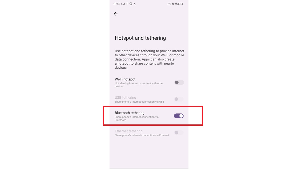 यसलाई सक्रिय गर्न तपाईंले अब ‘ब्लुटुथ टेदरिङ’ विकल्पमा टगल स्लाइड गर्नुपर्छ।