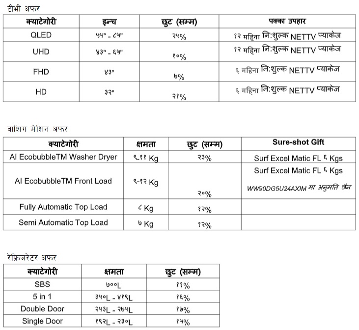 यो अफरलाई अझ आकर्षक बनाउन, चुनित टीभी मोडेल किन्दा रु ३००० बराबर १२ महिनासम्मको एनईटीटीभी प्याकेज निःशुल्क उपलब्ध हुनेछ। त्यसैगरी, चुनित वाशिंग मेशिन मोडेलको खरिदमा ६ किलो सर्फ एक्सेल म्याटिक पक्का उपहारको रूपमा निःशुल्क प्राप्त गरिने छ।