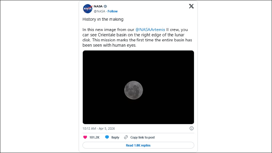 नासाले चालक दलले खिचेको चन्द्रमाको तस्बिर स्थानीय समय अनुसार आइतबार बिहान १०ः १२ बजे एक्समा पोस्ट गरेको छ। पोस्ट गरिएको उक्त तस्बिरमा क्षुद्रग्रहको प्रभावले बनेको क्रेटर देख्न सकिने उल्लेख गरिएको छ।