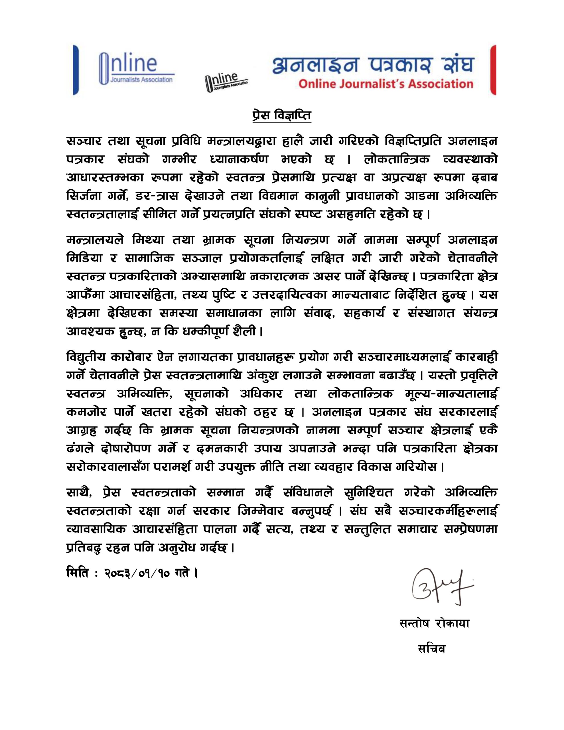 भ्रामक सूचना नियन्त्रणको नाममा सम्पूर्ण सञ्चार क्षेत्रलाई एकै ढंगले दोषारोपण गर्ने र दमनकारी उपाय अपनाउने भन्दा पनि पत्रकारिता क्षेत्रका सरोकारवालासँग परामर्श गरी उपयुक्त नीति तथा व्यवहार विकास गर्न अनलाइन पत्रकार संघ सरकारलाई आग्रह गरेको छ।